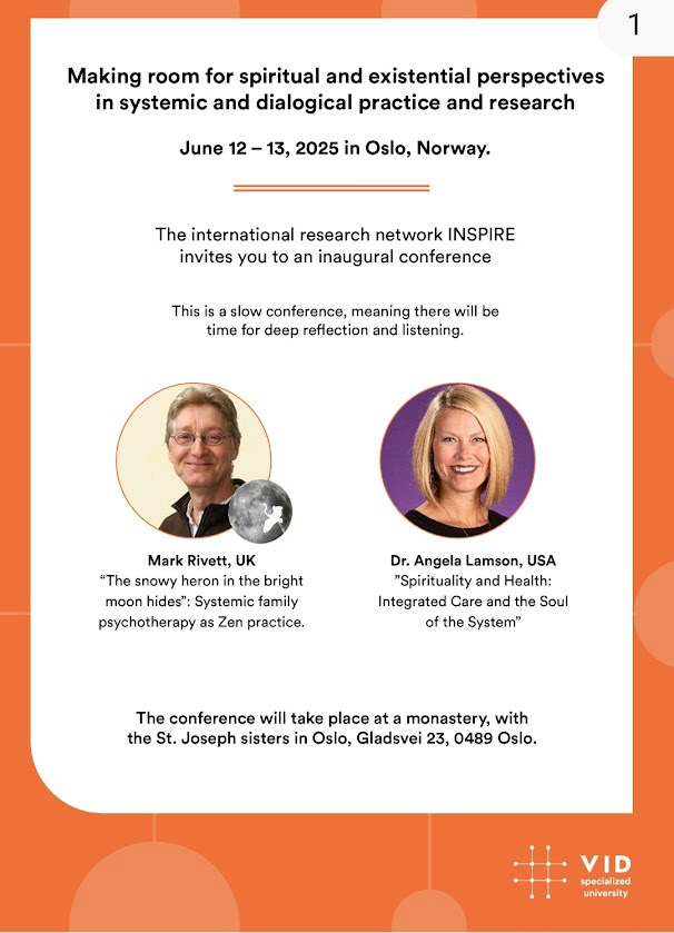 VID arrangerer konferanse I Juni 2025; "Making room for spiritual and existential perspectives in systemic and dialogical practice and research." Se link for mer informasjon: https://www.vid.no/en/events/inspire-conference-in-june-2025/